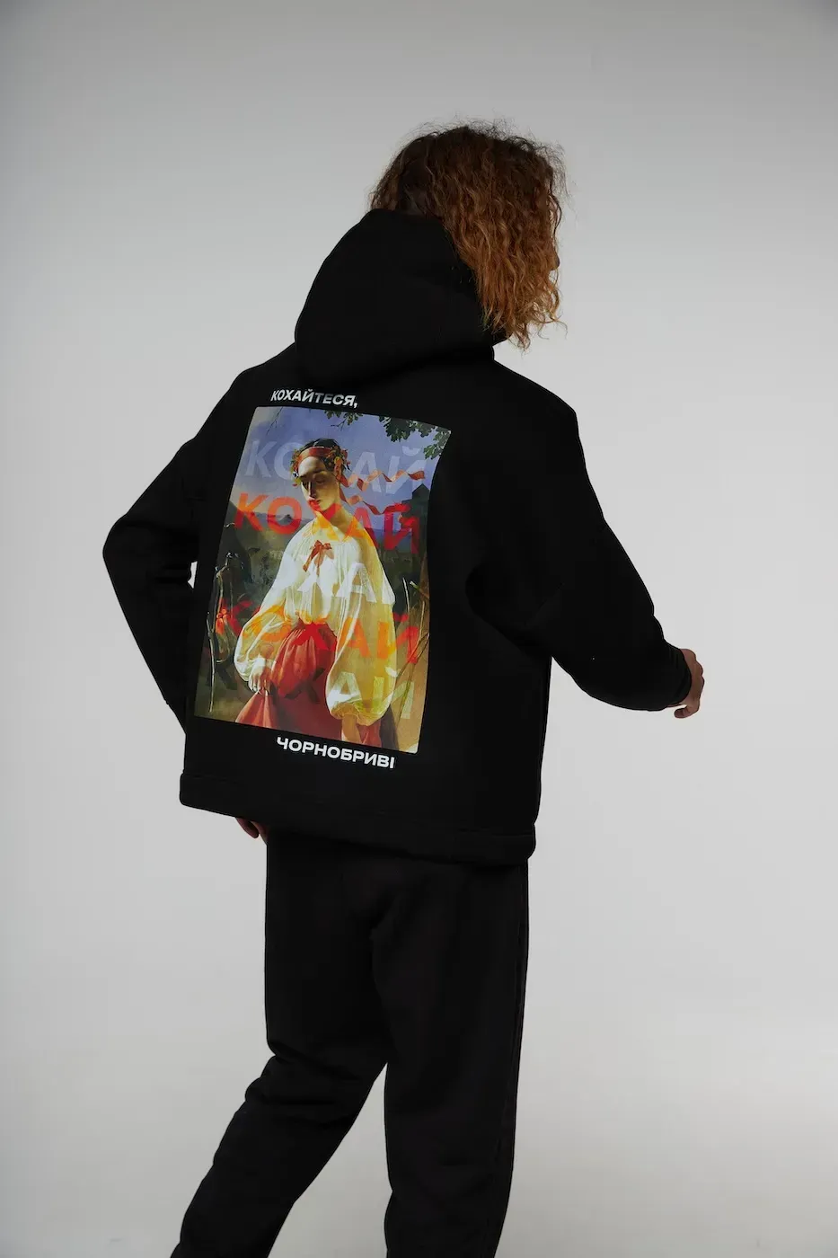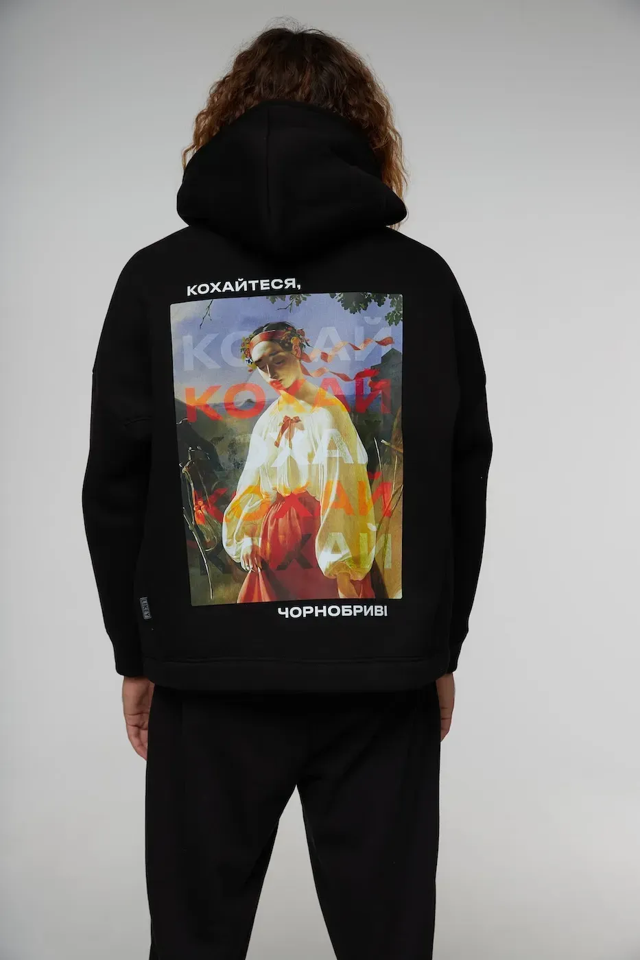 The oversized hoodie with the print ‘Love one another, black-browed beauties’ is a stylish creation that combines romance and patriotism. Made from soft, comfortable fabric.